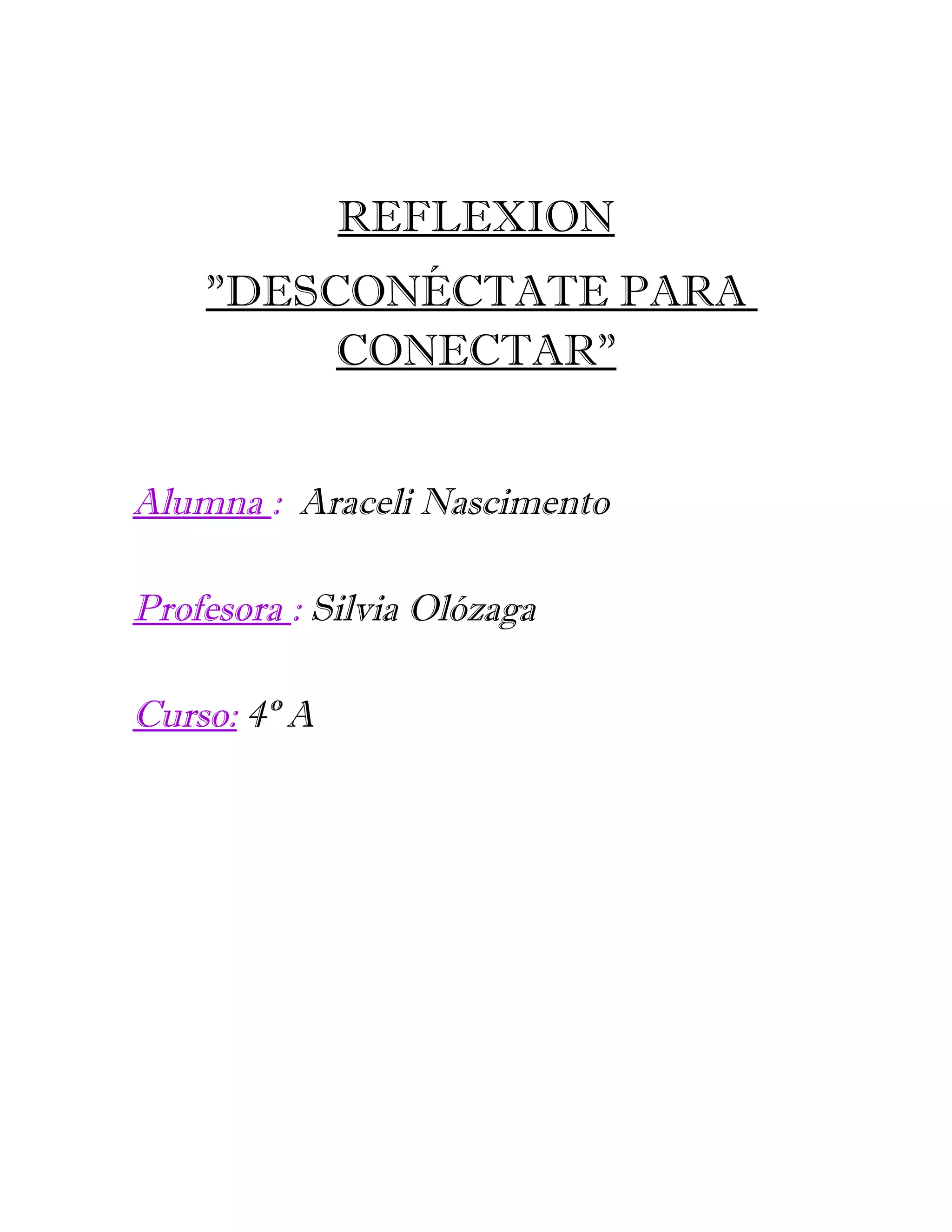 El documento es una reflexión de una estudiante sobre un video que muestra cómo las personas pasan demasiado tiempo conectadas a la tecnología y pierden la oportunidad de disfrutar de las personas y cosas que los rodean. El video sugiere que las personas a veces viven en una "burbuja" cuando están conectadas y no aprecian plenamente a su familia, amigos u otras cosas importantes de la vida real. La estudiante concluye que con tanta tecnología se ha perdido el contacto humano y la socialización.