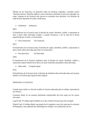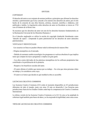 Este documento resume los principales aspectos del derecho de autor y las licencias Creative Commons. Explica que el derecho de autor protege los derechos morales y patrimoniales de los autores sobre sus obras. También describe las ventajas e inconvenientes del derecho de autor, los tipos de licencias Creative Commons y cómo obtener una licencia.