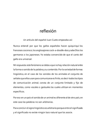 El artículo discute cómo los sonidos que hacen los gallos para anunciar el amanecer varían entre diferentes idiomas a pesar de que el canto del gallo es universal. Esto se debe a que no hay una relación natural entre la forma de una palabra y su significado, y los sonidos que usan los animales para comunicarse son limitados. Por lo tanto, los sonidos de los animales pueden ser diferentes en diferentes países aunque se refieran al mismo animal o acción.