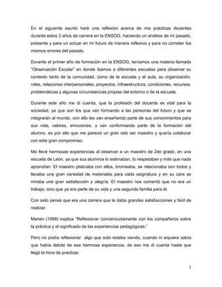 La autora reflexiona sobre sus prácticas docentes de los últimos 3 años en la carrera de magisterio. Reconoce que inicialmente tenía ideas idealizadas sobre la enseñanza, pero que al enfrentarse a la realidad de las aulas aprendió lecciones valiosas. A través de distintas experiencias fue mejorando su planeación, evaluación, manejo de grupos y adaptación a contextos. Reconoce la importancia de la reflexión retrospectiva y anticipada para no repetir errores y aplicar lo aprendido. Para su próxima práctica, planea integr