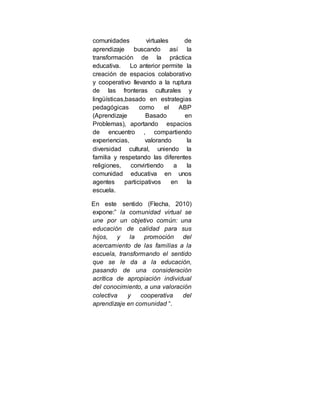 El documento reflexiona sobre cómo la interculturalidad se puede aplicar en el ámbito pedagógico mediante el uso de las TIC como estrategia motivadora e integradora en el contexto educativo. Esto permite fortalecer la labor educativa convirtiendo a las comunidades de aprendizaje en agentes de cambio a través de proyectos que tienen en cuenta las necesidades de los estudiantes y las comunidades. Además, las TIC permiten la creación de espacios colaborativos y cooperativos que rompen fronteras culturales y lingü