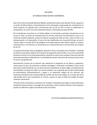 La autora, Leticia Esmeralda Martínez Botello, es una maestra de jardín de niños que constantemente se actualiza profesionalmente tomando cursos sobre el uso de TIC y computación. Su interés en lo digital la ha llevado a participar en cursos en línea y ser propuesta para una evaluación de permanencia, lo que la impulsa a prepararse más y mejorar su desempeño. Ahora incorpora las TIC en sus clases para involucrar a los estudiantes de manera activa en la construcción de su conocimiento. Anteriormente implementó con
