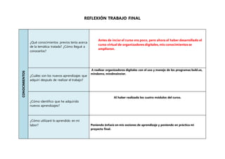 Este documento resume los conocimientos adquiridos y la participación en un curso virtual sobre organizadores digitales. Antes del curso, el autor tenía poco conocimiento sobre el tema, pero aprendió a usar herramientas como bubl.us, mindomo y mindmeinster para crear organizadores digitales. El autor completó los cuatro módulos del curso y compartió su trabajo final en el foro. En el futuro, aplicará estas habilidades en sus sesiones de aprendizaje. La única desventaja fue problemas publicando un mindomo en un blog.