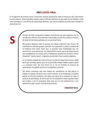 El documento presenta las reflexiones finales de tres estudiantes sobre su experiencia en un curso relacionado con las tecnologías de la información y la comunicación (TIC) aplicadas en el aula. Cada estudiante destaca cómo el trabajo autónomo y en grupo les ayudó a ampliar sus conocimientos sobre las TIC y su aplicación educativa, a pesar de las dificultades iniciales. También valoran positivamente el apoyo y la supervisión de la profesora durante el proceso de aprendizaje.