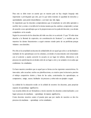 Guatemala reconoce la importancia de la educación para su desarrollo. Los docentes deben estar bien preparados académicamente y contextualizados culturalmente para facilitar procesos de enseñanza-aprendizaje significativos que valoren la diversidad del país. Un buen maestro escucha a los estudiantes, crea aprendizajes relevantes, y sirve como ejemplo a seguir para apoyar el desarrollo humano.