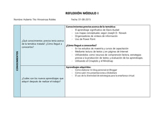 Este documento resume la reflexión de Huberto Tito Hinostroza Robles sobre su aprendizaje en el Módulo I. Identifica sus conocimientos previos sobre temas como el aprendizaje significativo y los mapas conceptuales. Aprendió a crear un blog personal y subir presentaciones a Slideshare. Planea utilizar estos conocimientos para dinamizar su blog y compartir aprendizajes. Participó activamente en el foro y puede mejorar la organización de su tiempo. La metodología propuesta le sirvió para aprender, aunque requirió más tiempo