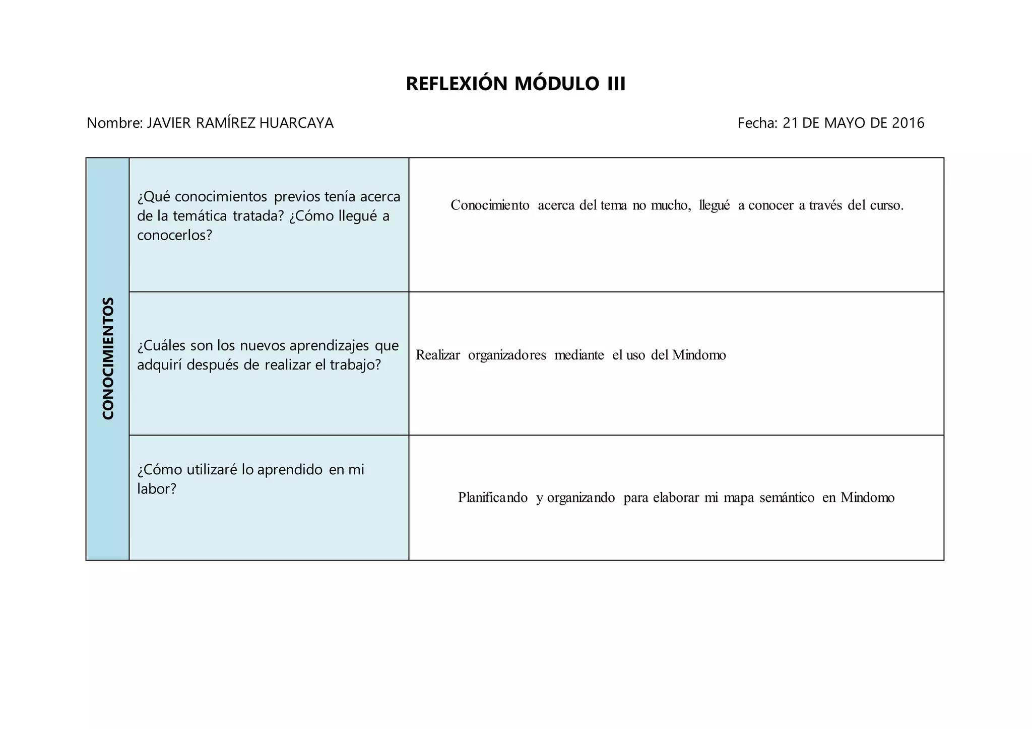Javier Ramírez realizó un mapa semántico en Mindomo para el módulo III. Aprendió a utilizar organizadores mediante Mindomo y planea aplicar esto en su trabajo organizando y planificando. Participó de forma regular construyendo el mapa de forma colaborativa siguiendo un tutorial y dando retroalimentación. La metodología propuesta le sirvió para aprender los contenidos mediante la organización de sus aprendizajes esperados, y las ventajas fueron realizar mapas organizadores digitales con Mindomo aunque registrarse en la página fue
