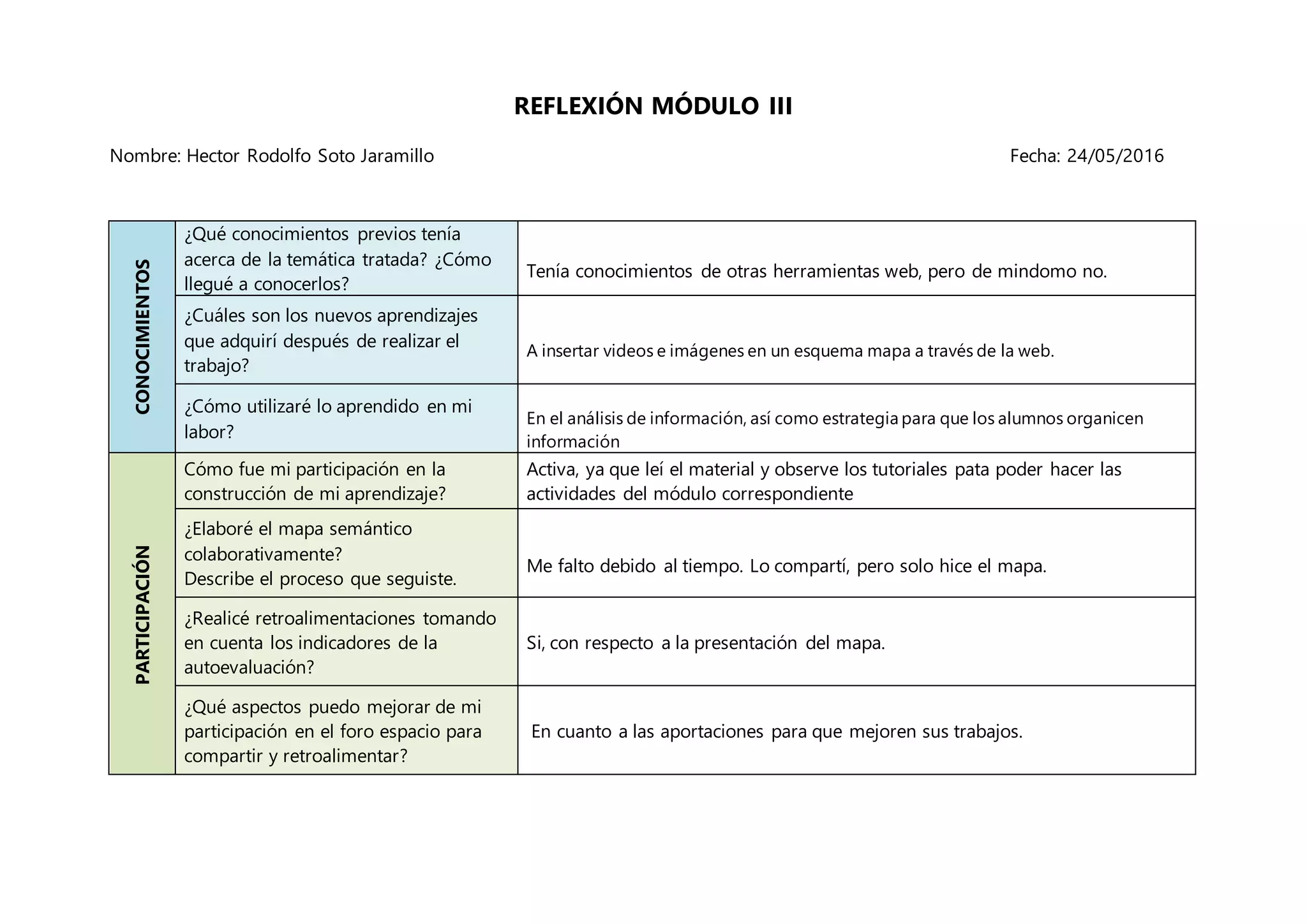 Hector Rodolfo Soto Jaramillo reflexiona sobre su aprendizaje en el Módulo III. Carecía de conocimientos previos sobre Mindomo, pero aprendió a insertar videos e imágenes en esquemas mentales. Utilizará estas habilidades para analizar información y ayudar a los estudiantes a organizar datos. Participó activamente leyendo material y tutoriales, aunque le faltó tiempo para completar un mapa colaborativo. La metodología propuesta le sirvió para comprender las actividades, y considera ventajoso compartir trabajos para mejor