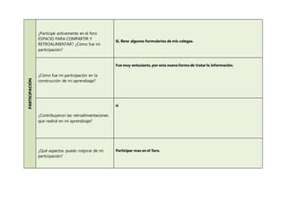 Juan realizó una reflexión sobre el Módulo III. Aprendió a crear formularios en Google, lo cual planea utilizar para sus sesiones de aprendizaje. Participó llenando formularios de sus compañeros y encontró la construcción de su aprendizaje muy entusiasta. La metodología propuesta le sirvió para aprender sobre los contenidos y vio como ventaja poder utilizar formularios en su vida académica profesional.