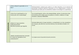 Maritza realizó un mapa semántico usando la herramienta MIndomo. Aprendió a usar las funciones básicas de MIndomo como cambiar formas, tamaños, colores e insertar imágenes. Participó elaborando el mapa semántico de forma colaborativa con dos compañeros y realizó retroalimentación tomando en cuenta los indicadores de autoevaluación. La metodología propuesta le sirvió para aprender los contenidos aunque vaya a paso lento, y no identificó desventajas en la actividad realizada