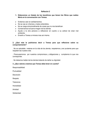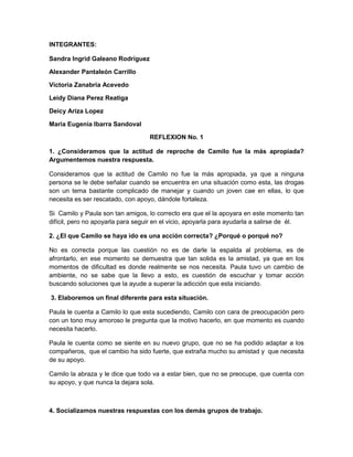 El documento presenta las reflexiones de un grupo de estudiantes sobre varios temas. En la Reflexión 1, discuten que la actitud de reproche de Camilo hacia su amiga Paula no fue la más apropiada cuando ella le contó sobre su problema con las drogas, y que lo mejor habría sido apoyarla. En la Reflexión 2, analizan los beneficios de los filtros que María usó en una conversación y valores que Teresa debe considerar. En la Reflexión 3, explican por qué la donación de los Gómez fue rechazada y cómo debieron actuar.