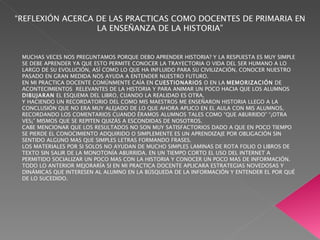 El documento reflexiona sobre la enseñanza de la historia en primaria. Señala que tradicionalmente se ha enseñado de forma aburrida, basada en memorización y cuestionarios, lo que hace que los estudiantes pierdan rápido el conocimiento y no le encuentren sentido. Propone que se necesitan estrategias más dinámicas e interesantes para los estudiantes, que les permitan buscar información por sí mismos y entender mejor el pasado.