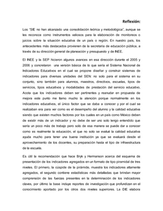 El documento discute los sistemas de indicadores educativos en México y las formas de mejorar su efectividad. Propone que los indicadores deben abarcar más factores que solo el desempeño estudiantil, como la infraestructura, los docentes y la supervisión. También recomienda presentar los indicadores en una pirámide de tres niveles para mejorar la comprensión. Concluye que los indicadores deben considerar las diferencias regionales para identificar mejoras a la calidad educativa.