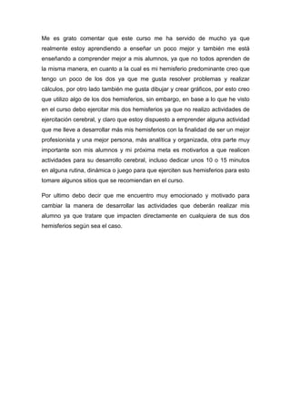 Este curso ha ayudado al autor a mejorar su enseñanza y comprensión de los estudiantes. El autor usa ambos hemisferios cerebrales, aunque necesita ejercitarlos más mediante actividades de estimulación cerebral. El autor también planea motivar a sus estudiantes a ejercitar sus propios hemisferios cerebrales a través de dinámicas cortas.