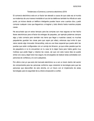 El comercio electrónico ha aumentado considerablemente debido a la modernización e implementación generalizada de teléfonos inteligentes, lo que permite a los usuarios comprar artículos con solo unos clics y recibirlos en sus casas. Algunas empresas han desarrollado llaves electrónicas para entregas más seguras, como AmazonKey, que permite a los repartidores abrir puertas configuradas con cerrojos compatibles para dejar paquetes dentro de las casas sin supervisión. Se espera que el mercado electrónico continúe creciendo a