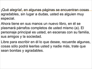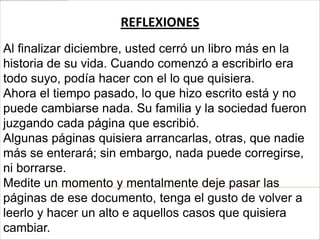 El documento presenta reflexiones sobre el paso del tiempo y la importancia de aprender de las experiencias pasadas para mejorar en el futuro. Se alienta al lector a escribir una nueva página enfocándose en acciones positivas como agradecer y pedir perdón. Finalmente, ofrece consejos para facilitar el aprendizaje centrándose en involucrar a los estudiantes y ayudarlos a descubrir por sí mismos a través de preguntas.