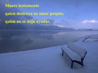 Este poema de Pablo Neruda advierte sobre las formas en que las personas pueden "morir lentamente", incluyendo no viajar, no leer, no escuchar música, no amarse a sí mismos, destruir su amor propio, evitar las pasiones y emociones, no cambiar cuando están insatisfechos y no arriesgar lo seguro por lo incierto. Alienta a las personas a vivir, arriesgarse y ser felices hoy en día.