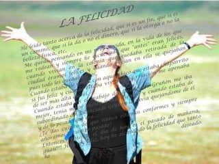 El documento presenta tres historias cortas sobre el amor y la felicidad. La primera historia compara el amor con un niño escondido, y explica cómo a veces confundimos la amistad con el amor. La segunda historia argumenta que la felicidad depende de estar conforme con el presente en lugar de añorar el pasado. La tercera historia cuenta la leyenda del Sol y la Luna, cuyo único momento de unión es durante un eclipse.