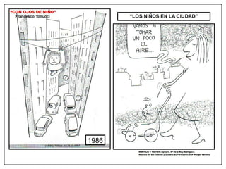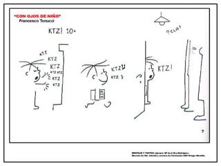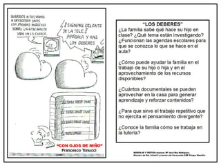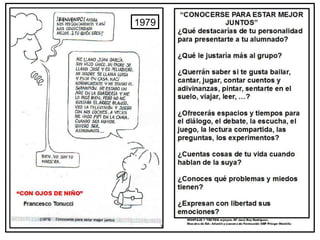 Este documento presenta las viñetas de Francesco Tonucci con el objetivo de reflexionar sobre la escuela actual y futura, mejorar la comunicación en la comunidad educativa, y analizar las prácticas del profesorado y las familias. Proporciona información sobre las viñetas de Francesco Tonucci y sobre recursos adicionales en blogs relacionados con la educación infantil.