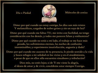El documento describe cómo la ausencia de la persona amada hace que los días sean más tristes y melancólicos, y cómo se siente irritable, insatisfecho y busca consuelo en los vicios. Pide a Dios no estar lejos y que le conceda estar siempre con Él, pues de Dios viene la alegría, el deseo de amar y vivir.