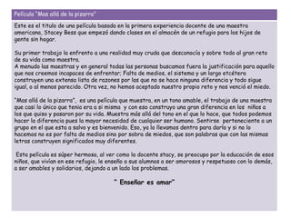 Este documento resume cinco películas: "El secreto", la cual trata sobre cómo los pensamientos pueden hacer realidad los sueños; "Más allá de la pizarra", sobre una maestra que enseña a niños sin hogar; "Taare Zamen Par", acerca de un niño con dislexia cuya vida cambia gracias a un maestro innovador; "El guerrero pacífico", sobre un atleta que aprende lecciones de vida para triunfar; y finalmente, todas las películas comparten mensajes sobre la superación personal y el poder