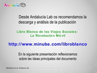 El documento reflexiona sobre el libro blanco "La Revolución Móvil" y cómo los viajeros ahora están hiperconectados a través de sus smartphones, buscando soluciones rápidas. Los viajeros comparten más información en línea y realizan más de sus compras a través de dispositivos móviles. Las empresas deben adaptarse a este nuevo perfil de viajero movilizado creando contenido para múltiples pantallas y redes sociales e integrando mejor la tecnología móvil en todas las etapas del viaje.