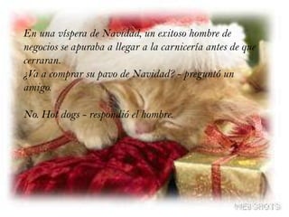 Un hombre de negocios exitoso compraba hot dogs en la víspera de Navidad para recordar cómo, años atrás, después de perder su fortuna, su familia celebró la Navidad con alegría comiendo hot dogs simulados, aprendiendo que lo más importante es estar juntos y apreciar lo que se tiene. El hombre concluye que la Navidad debe ser una celebración de los valores familiares de fraternidad y unidad que Jesucristo representa.