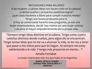 El documento alienta a las mujeres a emprender y lograr sus sueños y metas. Les pregunta cuántas ideas y proyectos tienen en mente y qué hacen diariamente para cumplirlos. Luego propone que si ya se hacen esas preguntas, son mujeres emprendedoras y deben decidir ser exitosas y alcanzar el mayor empoderamiento propio. Cita a Amalia Fortabat, la mujer empresaria más rica de Argentina, quien siempre tuvo muchas ideas en la cabeza y proyectos que no le alcanzaría la vida para realizar.