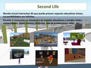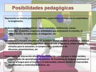 Este documento describe el potencial educativo del mundo virtual Second Life. Según el documento, Second Life permite la inmersión en simulaciones de mundos educativos y sociales reales como universidades y clases. Ofrece posibilidades como clases tutoriales, conferencias y actividades que promueven la creación, el arte y la exploración. Además, permite el trabajo colaborativo entre estudiantes sin necesidad de un espacio físico y facilita el intercambio de contenidos educativos.