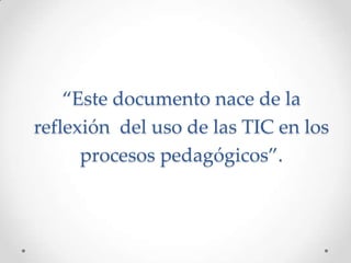 Este documento presenta 10 reflexiones sobre el uso de las tecnologías de la información y la comunicación (TIC) en la formación. Las TIC pueden ser usadas para construir un aprendizaje colaborativo, dinamizar el currículo y estimular el aprendizaje autónomo. También permiten evaluaciones permanentes e implican los puntos de vista de la comunidad educativa. El uso de las TIC acerca a los estudiantes y amplía los conceptos de información, educación y conocimiento.