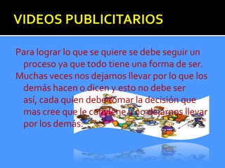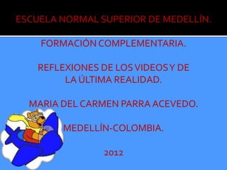 El documento resume las reflexiones de María del Carmen Parra Acevedo sobre la formación complementaria en la Escuela Normal Superior de Medellín en 2012. Enfatiza la importancia de seguir un proceso para lograr los objetivos, tomar decisiones propias en lugar de dejarse influenciar por otros, y cultivar la imaginación e inocencia de los niños. También destaca la importancia de la educación con amor y autoridad por parte de los padres, y de ser buenos ejemplos para los niños.