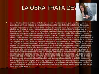 Este documento resume una obra de teatro que trata sobre los problemas que enfrentan cinco adolescentes, incluyendo embarazos no deseados, relaciones sexuales sin protección, desintegración familiar, drogadicción y deserción escolar. Enfatiza la importancia de pensar en las consecuencias antes de actuar y cuidarse adecuadamente.