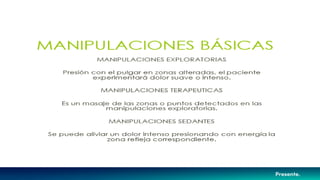 La reflexología es una práctica terapéutica que utiliza el masaje en pies para aliviar dolores y enfermedades, basada en principios de la medicina tradicional china. Estimula la energía vital y mejora diversas funciones del organismo, promoviendo la eliminación de toxinas y desbloqueo emocional. La técnica se aplica presionando puntos reflejos en los pies, lo que permite un tratamiento holístico que potencia la autocuración del paciente.