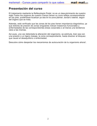 El documento proporciona información sobre la reflexología podal. Explica que la reflexología podal se basa en la idea de que los pies contienen zonas reflejas que corresponden a diferentes órganos y partes del cuerpo, y que masajear estas zonas puede ayudar a mejorar la salud de los órganos correspondientes. También describe brevemente la historia y evolución de la reflexología podal, incluyendo sus orígenes en China y su desarrollo en Europa y Estados Unidos. Finalmente, explica cómo los pies se dividen