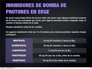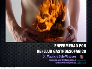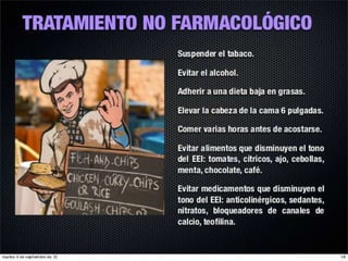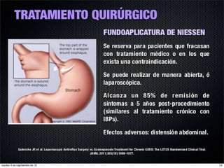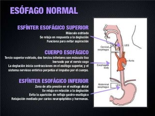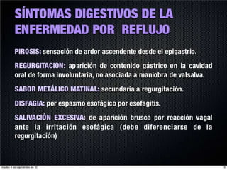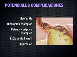 El reflujo gastroesofágico es una afección donde los alimentos o líquidos regresan del estómago hacia el esófago, lo que puede irritar el esófago y causar acidez u otros síntomas. La enfermedad no es causada por la gastritis como comúnmente se cree, sino por la debilidad del esfínter esofágico que normalmente impide el paso de contenido gástrico hacia el esófago. Los factores que desencadenan el reflujo incluyen el aumento de la presión abdominal, ci