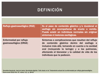 Este documento trata sobre el reflujo gastroesofágico (RGE) y la enfermedad por reflujo gastroesofágico (ERGE). Define el RGE como el paso de contenido gástrico al esófago sin acompañarse de eructo o vomito, mientras que la ERGE causa síntomas o complicaciones debido al reflujo. Explica los mecanismos fisiológicos antirreflujo, la fisiopatología, el cuadro clínico, diagnóstico y tratamiento de la ERGE, incluy