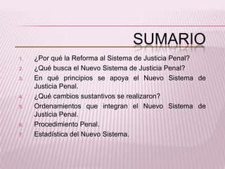 Este documento describe los principales cambios realizados al sistema de justicia penal en México como parte de una reforma integral. Explica los principios, cambios sustantivos en áreas como procuración de justicia, administración de justicia y sistema penitenciario. También detalla los ordenamientos legales que comprenden el nuevo sistema, los procedimientos penales, y las funciones del juez de garantía y el tribunal oral.