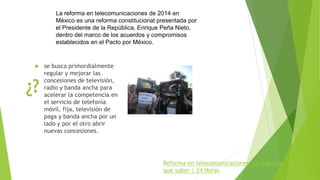 La reforma de telecomunicaciones de 2014 en México busca regular y mejorar las concesiones de televisión, radio y banda ancha para aumentar la competencia en los servicios de telefonía, así como abrir nuevas concesiones. Sin embargo, algunos argumentan que la reforma permitirá abusos a la libertad de expresión y presenta riesgos de censura en internet y vigilancia excesiva de las telecomunicaciones. La reforma también crea un nuevo Instituto Federal de Telecomunicaciones para regular el sector de manera autónoma.