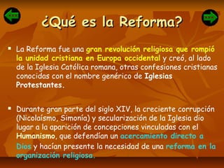 El documento describe la Reforma y Contrarreforma. La Reforma rompió la unidad cristiana en Europa y creó nuevas confesiones como el protestantismo. Lutero criticó la venta de indulgencias y las enseñanzas de la Iglesia Católica, iniciando la Reforma protestante. La Contrarreforma fue la reacción de la Iglesia Católica a la Reforma, intentando reformarse a sí misma y contrarrestar las nuevas doctrinas protestantes.
