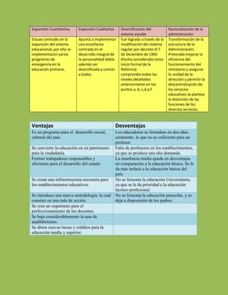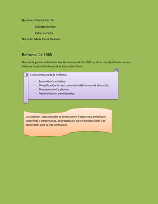Durante la gestión de Eduardo Frei Montalva en 1965, se inició una reforma gradual y profunda de la educación chilena con los objetivos de expansión cuantitativa y cualitativa del sistema, diversificación del mismo y racionalización de la administración. Las tareas centrales de la reforma incluyeron la expansión de la educación primaria, el desarrollo integral de la personalidad de los estudiantes, y la transformación de la estructura administrativa para mejorar la eficiencia.