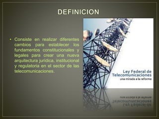 La reforma de telecomunicaciones en México de 2013 realizó cambios constitucionales y legales para crear una nueva estructura regulatoria en el sector. La reforma estableció la portabilidad numérica, eliminó cuotas de larga distancia y permitió consultar saldos sin costo. También requirió el apagón analógico de televisión, dos cadenas públicas y elementos de accesibilidad. Además, buscó mejorar el acceso a Internet y conservar las comunicaciones de los operadores, aunque también generó preocupaciones sobre vigil