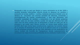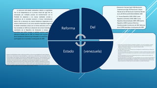 Venezuela ha tenido varias reformas importantes desde su independencia en 1830, incluyendo cambios en su estructura estatal y ordenamiento jurídico. La constitución de 1961 fue reformada y luego reemplazada por la constitución de 1999 tras la Asamblea Constituyente, la cual creó dos nuevos poderes públicos, el poder ciudadano y el poder electoral, y descentralizó más el estado.