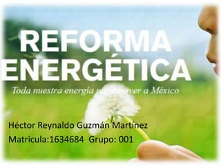 Este documento resume la reforma energética propuesta en México. Propone modificar los artículos 25, 27 y 28 de la constitución para reformar el sector energético y darle mayor autonomía a Pemex. Apoya la reforma por sus beneficios como la creación de empleos y tarifas eléctricas competitivas, pero señala posibles desventajas como la dependencia de empresas extranjeras.