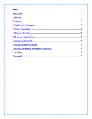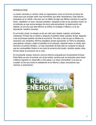 La reforma energética propuesta busca abrir el sector energético a la inversión privada a través de contratos de utilidad compartida y transformar a Pemex y CFE. Algunos ven esto como privatización, mientras que otros apoyan que esto podría aumentar la producción de hidrocarburos. La reforma también pretende proteger el medio ambiente fomentando energías renovables, aunque se critica que no ha habido suficiente progreso en esta área.