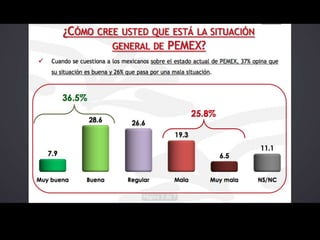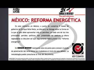 La reforma energética propone permitir contratos entre Pemex y empresas privadas para aumentar la inversión en exploración de hidrocarburos. El documento discute las posturas de diferentes partidos políticos sobre esta reforma. El PRI la apoya porque aumentará la producción petrolera, crecimiento económico y empleos. El PRD se opone y busca una consulta ciudadana. El PAN la apoya con condiciones para avanzar su agenda, pero debe ejercer influencia sobre el gobierno y legisladores.
