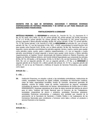 El documento presenta un resumen de las reformas, adiciones y derogaciones a la Ley de Protección y Defensa al Usuario de Servicios Financieros. Entre los cambios más importantes se encuentran el fortalecimiento de la Comisión Nacional para la Protección y Defensa de los Usuarios de Servicios Financieros (CONDUSEF) mediante la creación de un Buró de Entidades Financieras y la ampliación de sus facultades, así como la regulación de las cláusulas abusivas en los contratos de adhesión de las instituciones financ