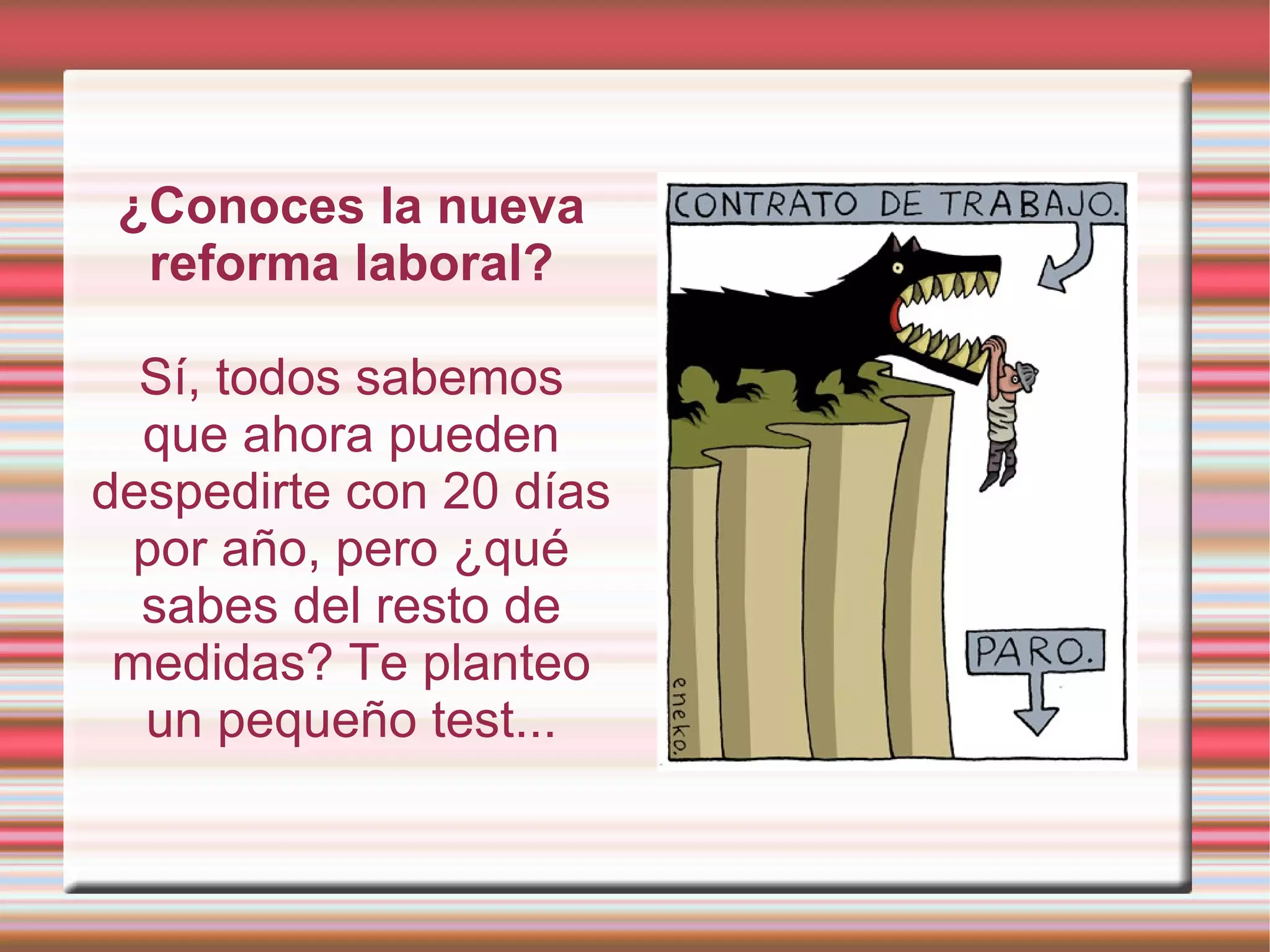 La reforma laboral introduce numerosos cambios que facilitan el despido de trabajadores y reducen su protección. Entre ellos se incluyen permitir despidos por bajas justificadas de 9 días o más, considerar todos los despidos como procedentes a menos que el trabajador demuestre lo contrario, y permitir a las empresas modificar unilateralmente las condiciones laborales. La reforma también facilita los despidos colectivos sin autorización previa y puede afectar a los empleados públicos.