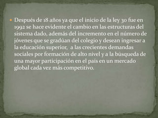 El documento analiza la propuesta de reforma a la ley de educación superior en Colombia. Plantea que la reforma surge de la necesidad de reestructurar el sistema educativo para responder a las demandas de formación de calidad. Sin embargo, critica que la propuesta del gobierno es privatista e insuficiente para garantizar el acceso a la educación superior como un derecho fundamental para todos los colombianos.
