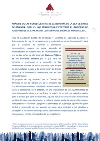 Este documento analiza las posibles consecuencias negativas de la reforma de la Ley de Bases de Régimen Local propuesta por el gobierno de Rajoy desde la perspectiva de los servicios sociales municipales. Argumenta que la reforma supondría un alejamiento de los ciudadanos de la política, profundizaría la brecha entre ciudadanos y políticos, vaciaría de servicios el mundo rural y menospreciaría el valor de la proximidad que garantizan las entidades locales.