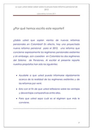 Este documento resume las ventajas y desventajas de los dos regímenes pensionales existentes en Colombia - el régimen de prima media con prestación definida y el régimen de ahorro individual con solidaridad. Analiza cómo cada régimen podría afectar a los trabajadores colombianos dependiendo de su situación particular y plantea dudas sobre si es justo eliminar el régimen de prima media a través de la reforma pensional propuesta para 2012.